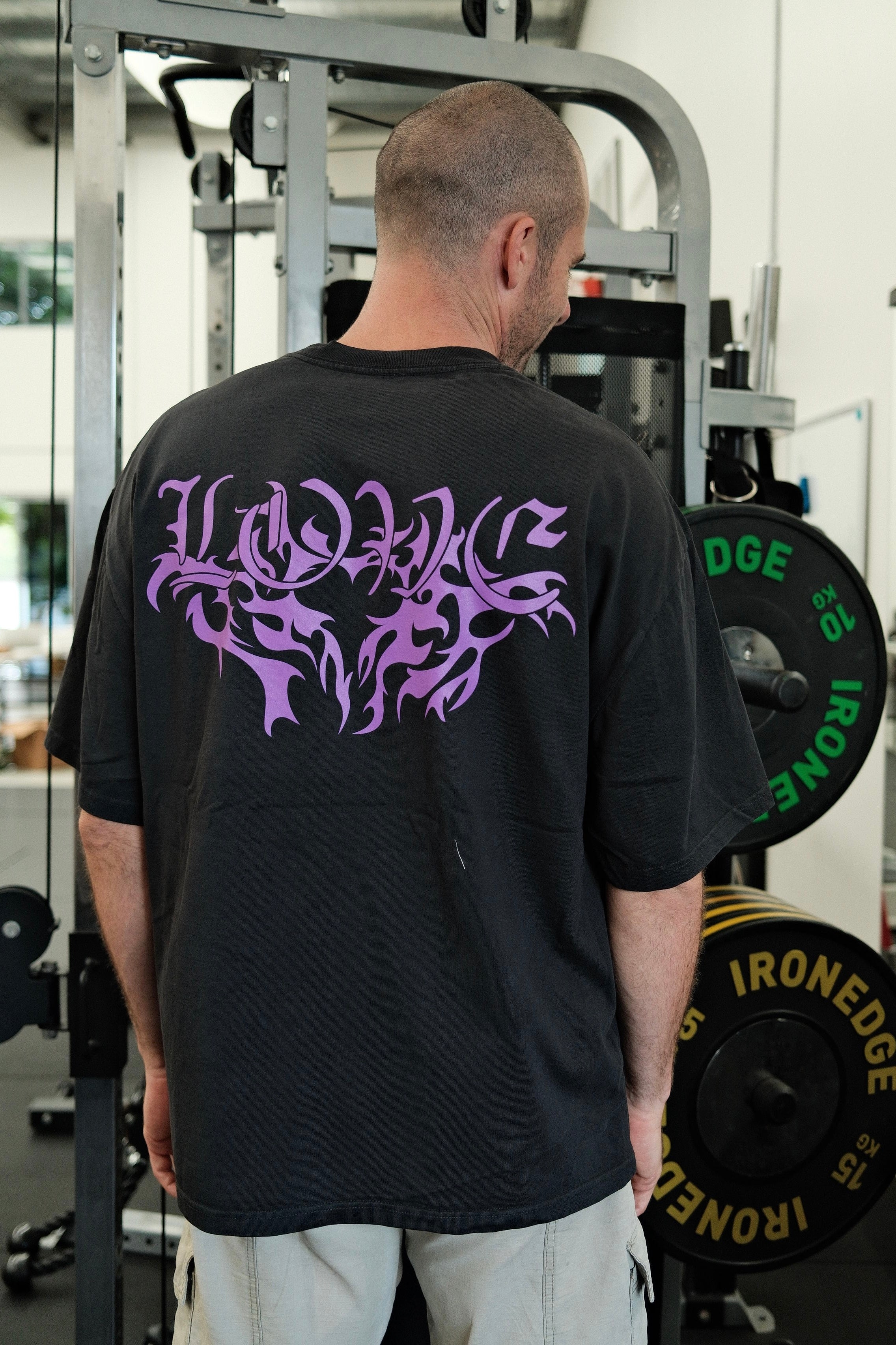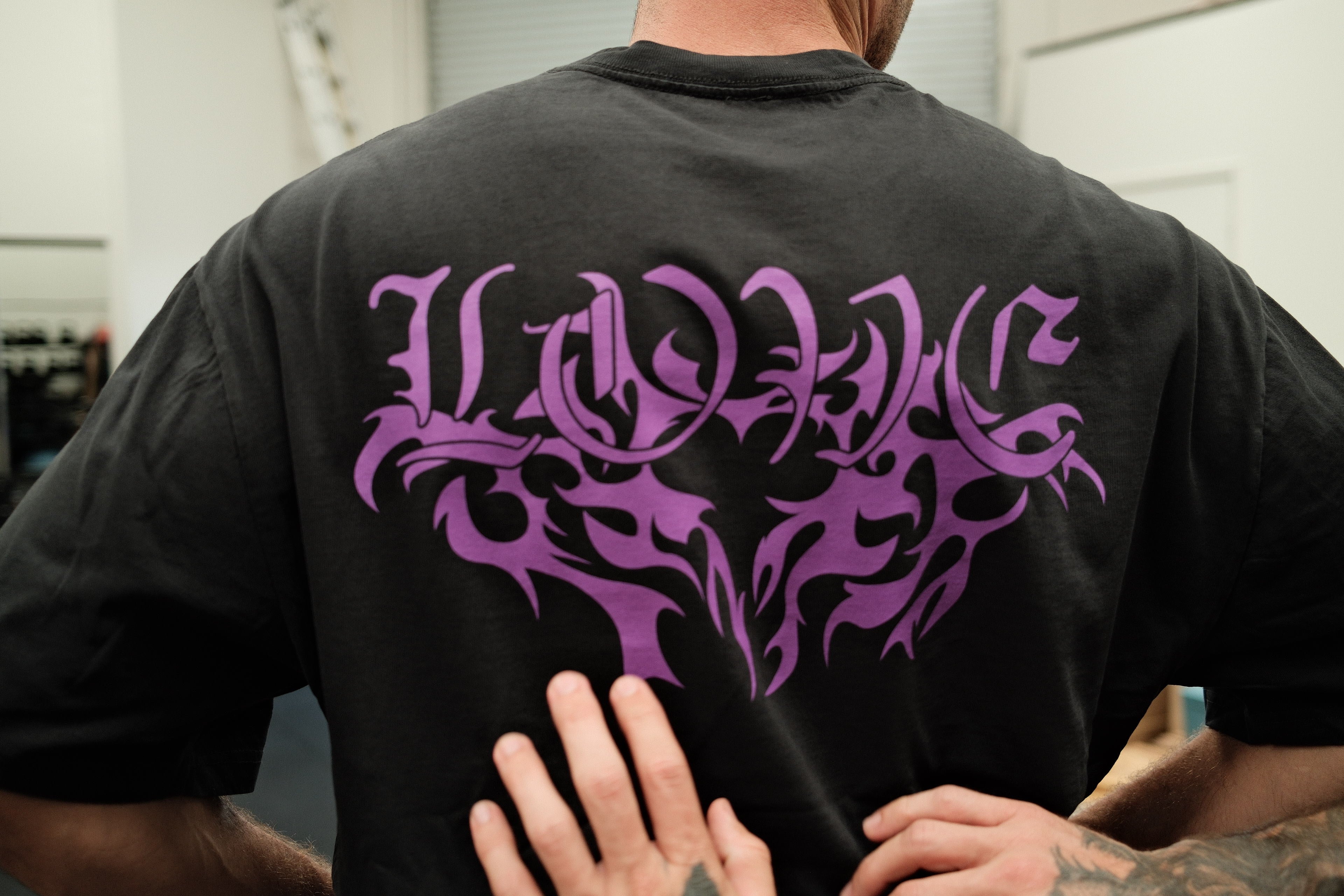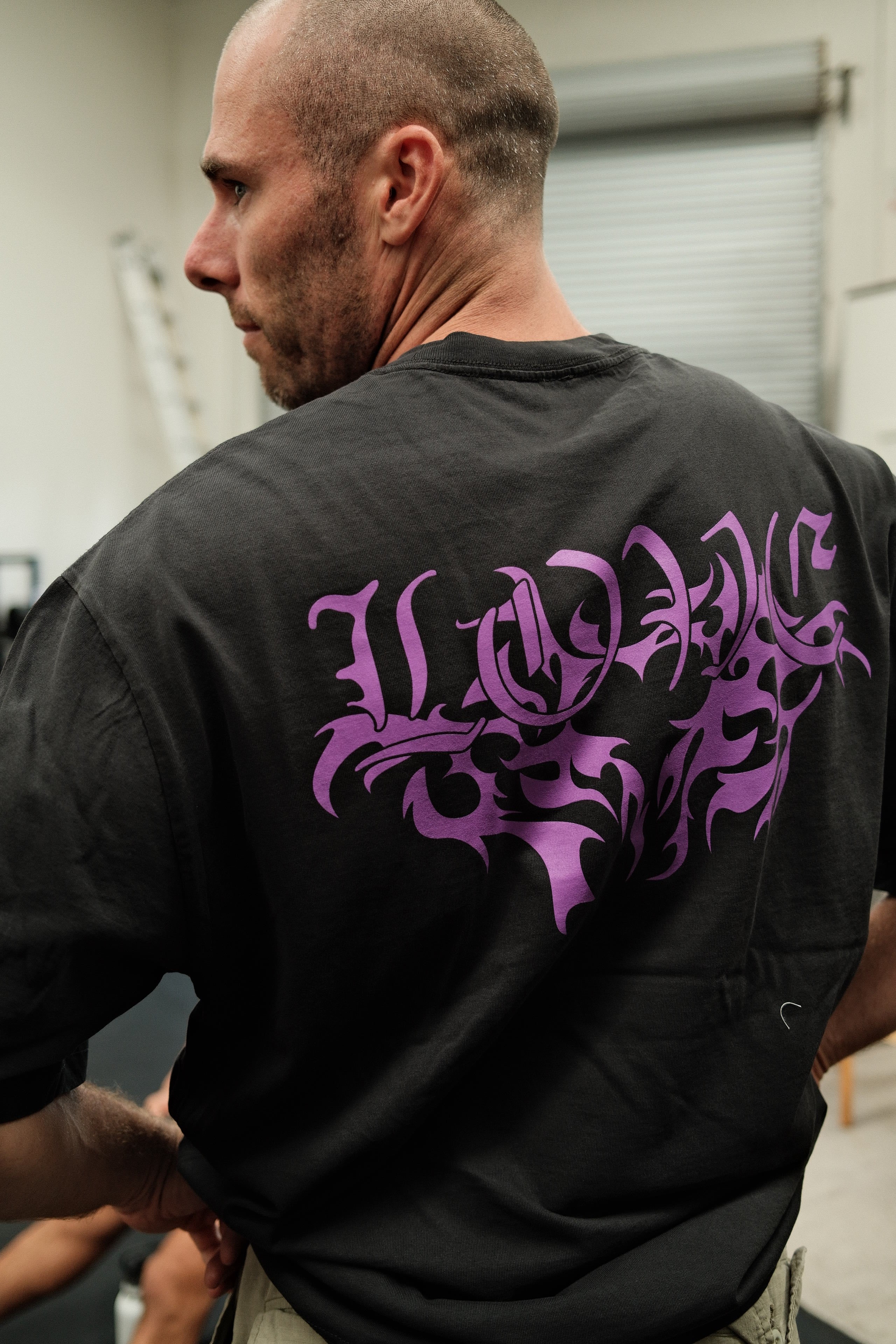 Deep purple graphic on a black heavy tee.