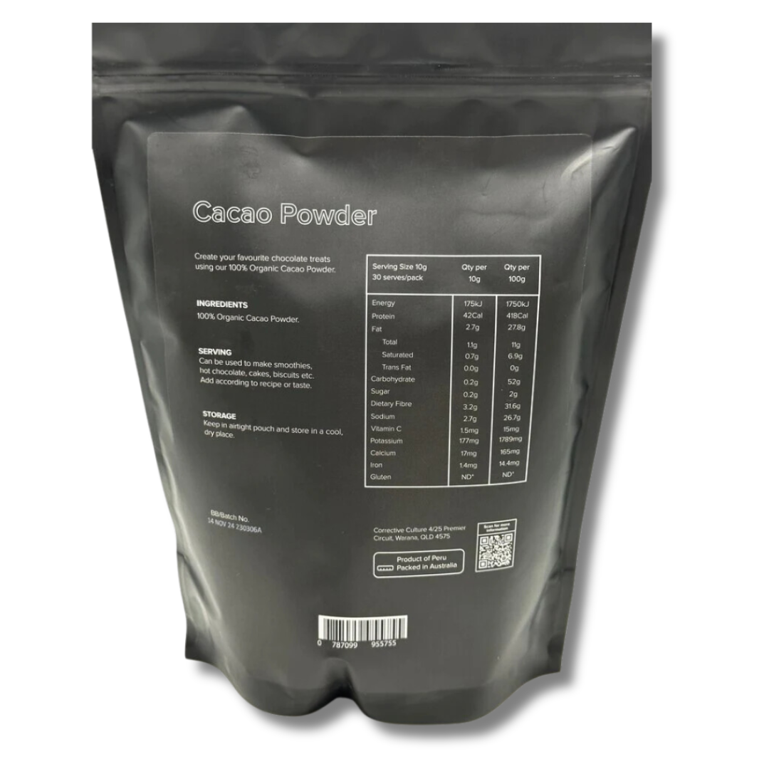 Organic cacao powder in large 500g bags. Used for hot chocolates, smoothies and desserts. Our organic cacao is packed full of flavonoids and other antioxidants that can assist with improved heart health, boosted mood, enhanced cognitive function, and increased energy and alertness. Packed with essential minerals and nutrients, our organic cacao powder not only nourishes your body, but also promotes radiant skin.
